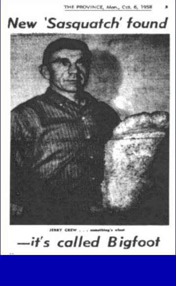 Jerry Crew made a plaster cast of one of these footprints and took it to the Local newspaper. The newspaper editor commentated on it being a ‘big’ foot, and ran the story with the word ‘Bigfoot’ used for the first time. The resulting news story was picked up by the associated press wire and Bigfoot was famous.